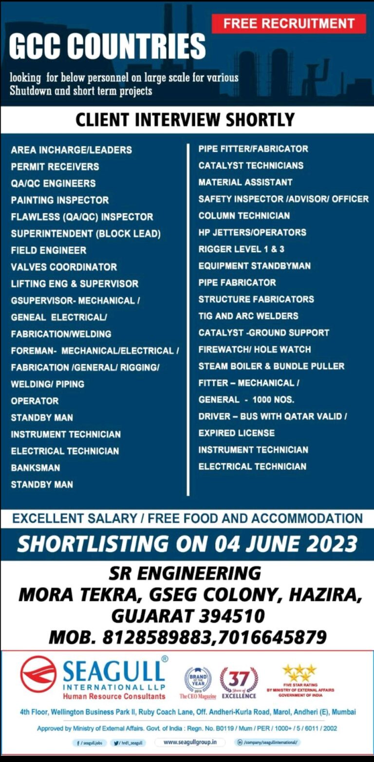 FREE RECRUITMENTGCC COUNTRIESlooking for below personnel on large scale for variousShutdown and short term projectsCLIENT INTERVIEW SHORTLYAREA INCHARGE/LEADERS PERMIT RECEIVERS …