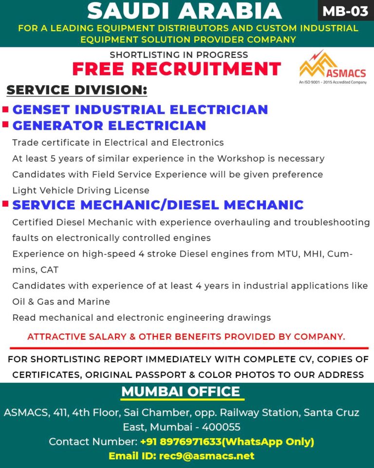 FOR A LEADING EQUIPMENT DISTRIBUTORS AND CUSTOM INDUSTRIALEQUIPMENT SOLUTION PROVIDER COMPANYSHORTLISTING IN PROGRESSFREE RECRUITMENTSERVICEDIVISION:■ GENSET INDUSTRIAL ELECTRICIAN■ GENERATOR ELECTRICIANTrade certificate …