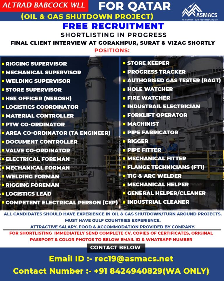 ALTRAD BABCOCK WLL FOR QATAR(OIL & GAS SHUTDOWN PROJECT)FREE RECRUITMENTSHORTLISTING IN PROGRESSFINAL CLIENT INTERVIEW AT GORAKHPUR, SURAT & VIZAG SHORTLYPOSITIONS:■ …
