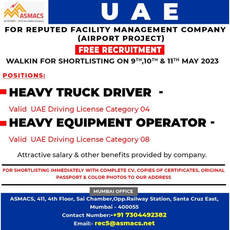 UAEFOR REPUTED FACILITY MANAGEMENT COMPANY (AIRPORT PROJECT)FREE RECRUITMENTWALKIN FOR SHORTLISTING ON 9TH, 10TH & 11TH MAY 2023POSITIONS:-HEAVY TRUCK DRIVERValid UAE …