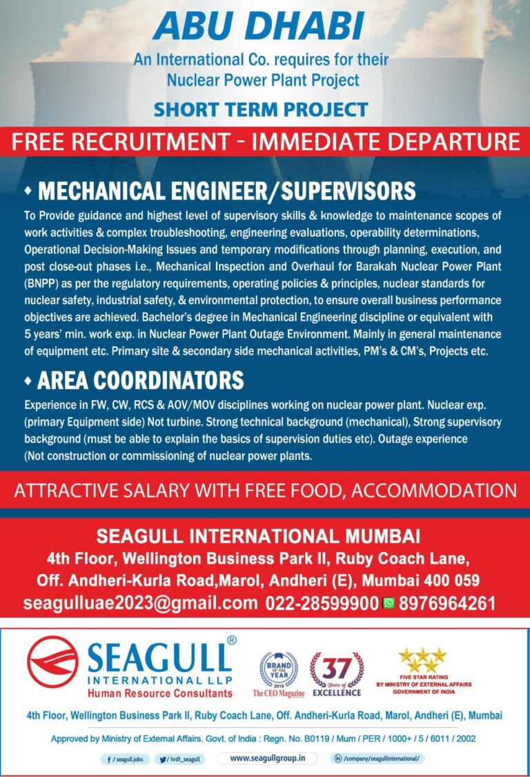 ABU DHABIAn International Co. requires for theirNuclear Power Plant ProjectSHORT TERM PROJECTFREE RECRUITMENT – IMMEDIATE DEPARTURE