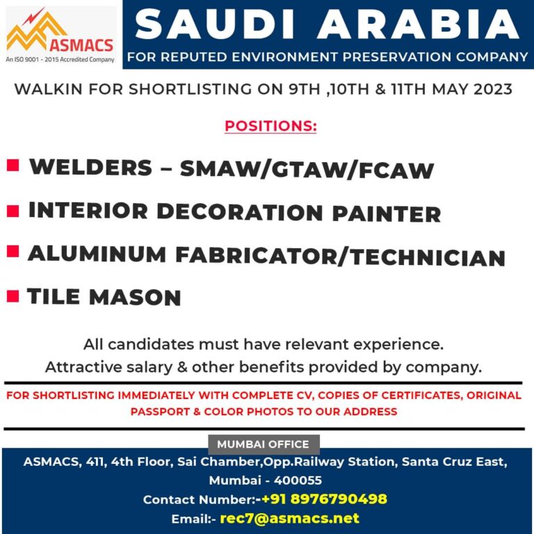 SAUDI ARABIAAn ISO 9001-2015 Accredited Company FOR REPUTED ENVIRONMENTPRESERVATION COMPANYWALKIN FOR SHORTLISTING ON 9TH,10TH & 11TH MAY 2023POSITIONS:☐ WELDERS – …