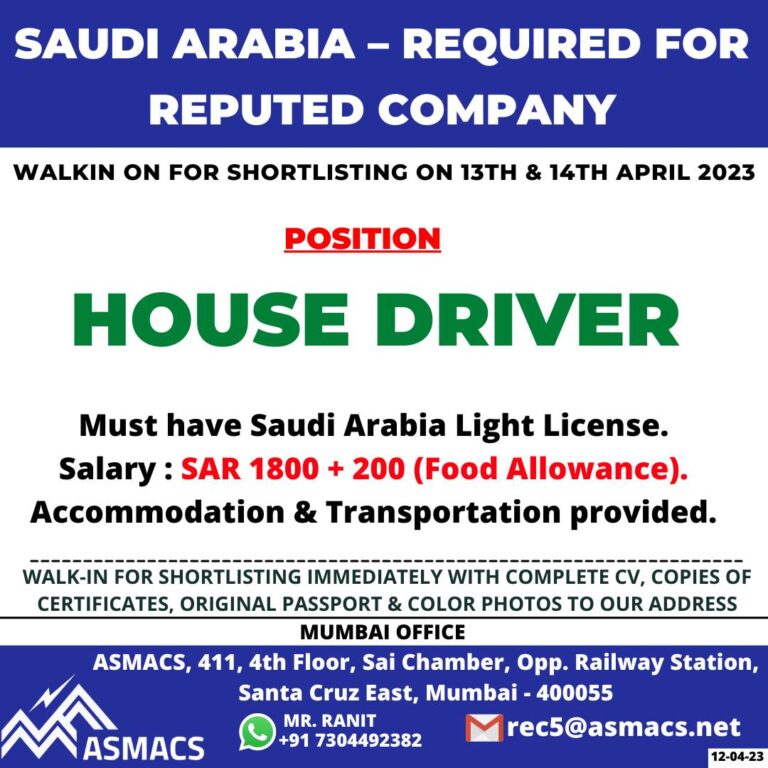 SAUDI ARABIA – REQUIRED FORREPUTED COMPANYWALKIN ON FOR SHORTLISTING ON 13TH & 14TH APRIL 2023POSITIONHOUSE DRIVERMust have Saudi Arabia Light …