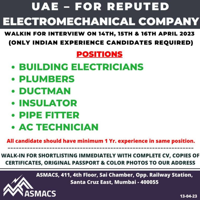 UAE FOR REPUTEDELECTROMECHANICAL COMPANYWALKIN FOR INTERVIEW ON 14TH, 15TH & 16TH APRIL2023 (ONLY INDIAN EXPERIENCE CANDIDATES REQUIRED)POSITIONS