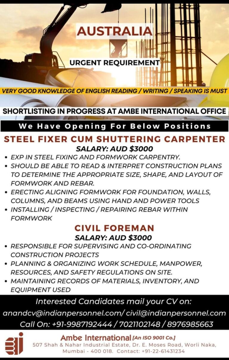 URGENT REQUIREMENTVERY GOOD KNOWLEDGE OF ENGLISH READING/WRITING/SPEAKING IS MUSTSHORTLISTING IN PROGRESS AT AMBE INTERNATIONAL OFFICEWe Have Opening For Below Positions …
