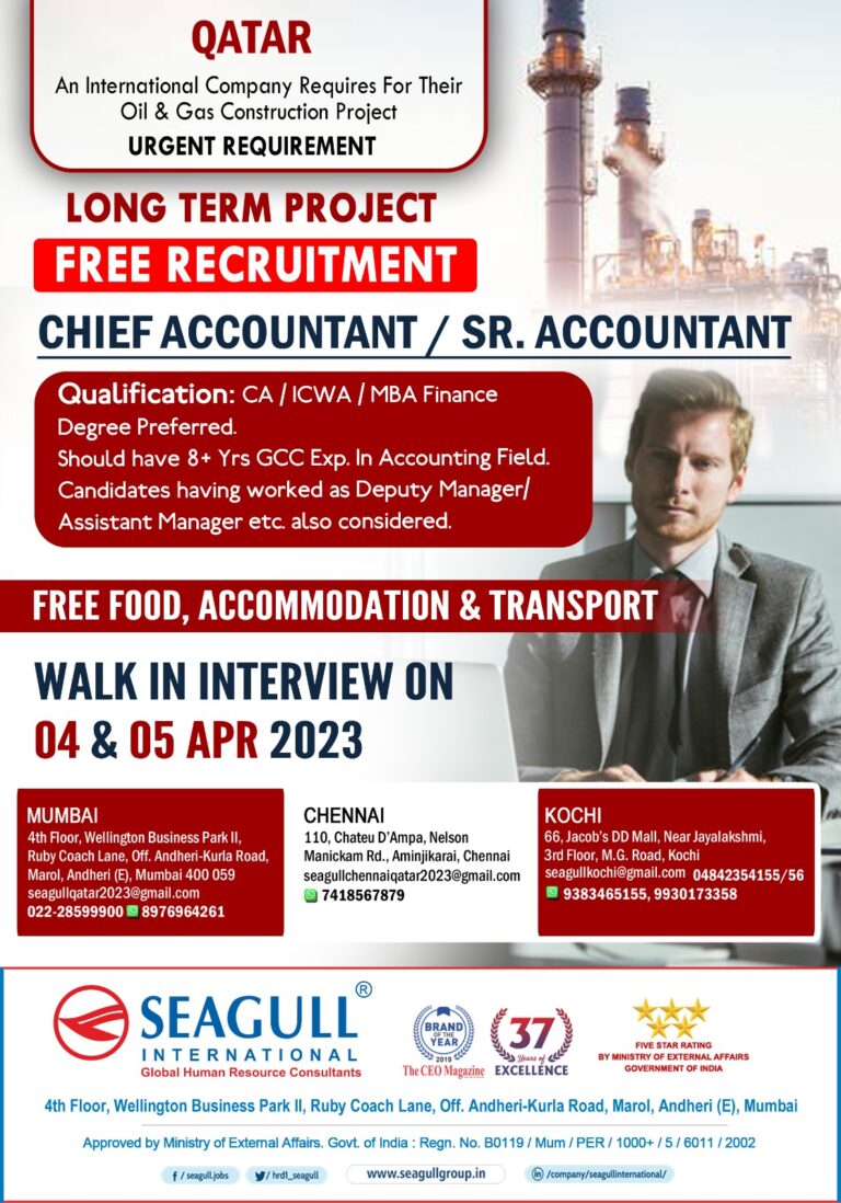QATARAn International Company Requires For TheirOil & Gas Construction ProjectURGENT REQUIREMENTLONG TERM PROJECTFREE RECRUITMENTCHIEF ACCOUNTANT/SR. ACCOUNTANTQualification: CA / ICWA / …
