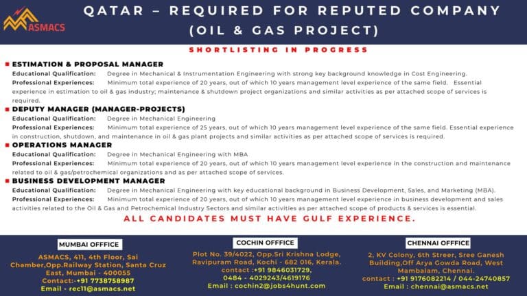 REQUIRED FOR REPUTED COMPANY (OIL & GAS PROJECT) QATAR