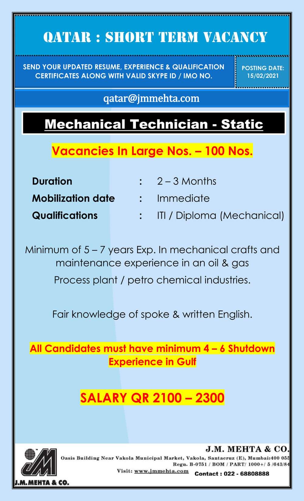 Minimum of 5 — 7 years Exp. In mechanical crafts and