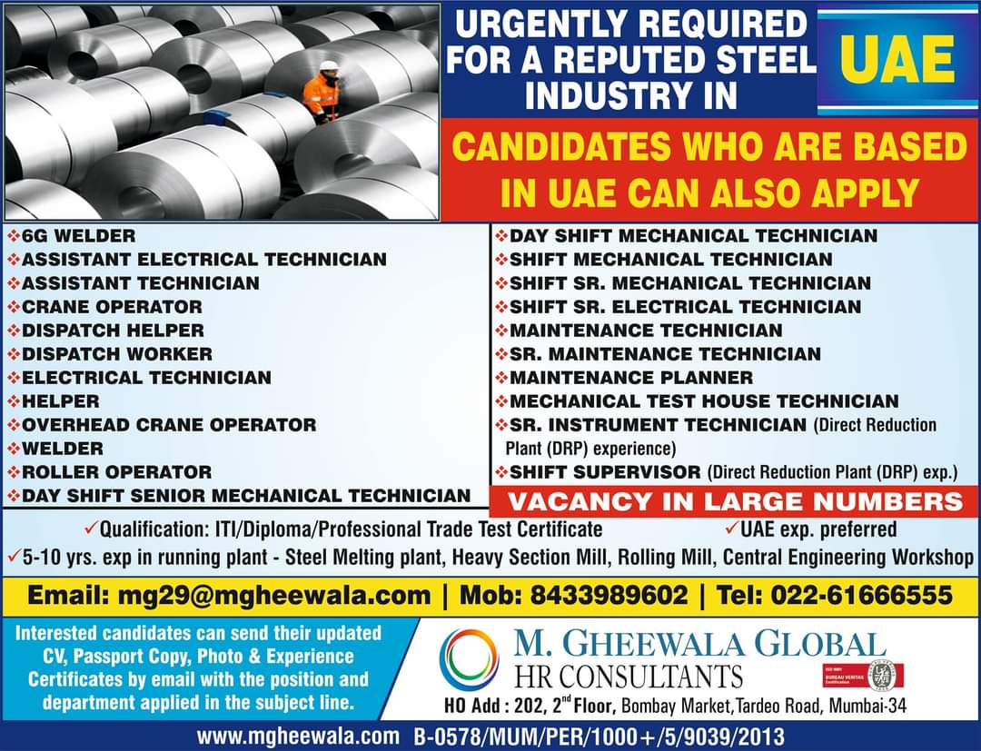 v 5-10 yrs. exp in running plant – Steel Melting plant, Heavy Section Mill, Rolling Mill, Central Engineering Workshop