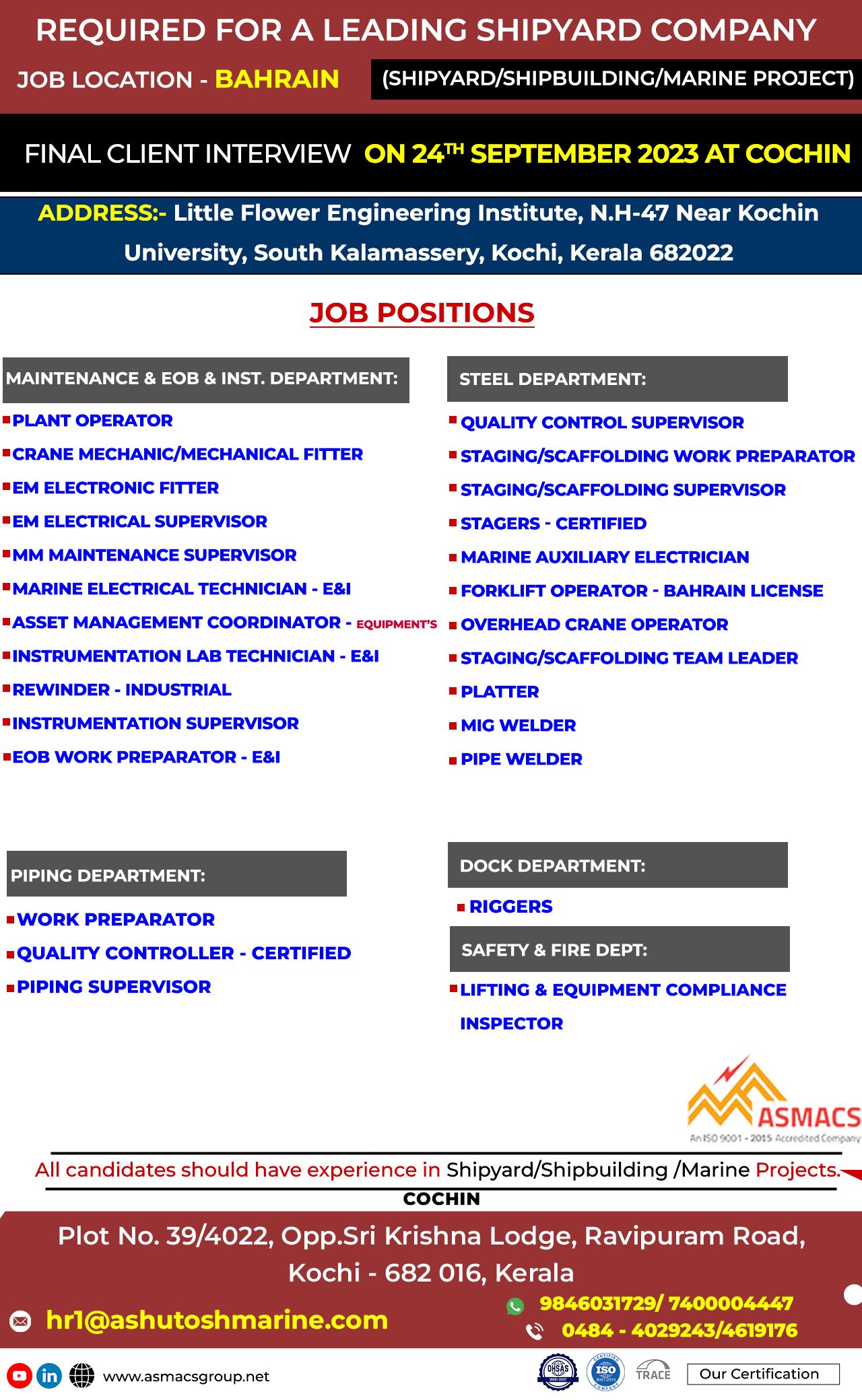 All candidates should have experience in Shipyard/Shipbuilding /Marine Projects.