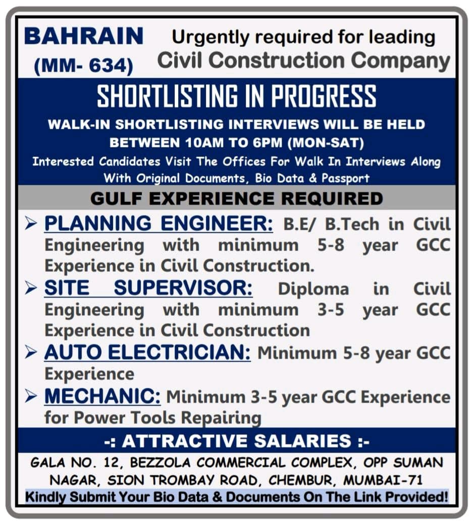 BAHRAIN Urgently required for leading (MM-634) Civil Construction Company