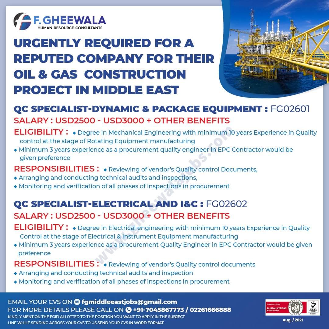 Minimum 3 years experience as a procurement Quality Engineer in EPC Contractor would be given