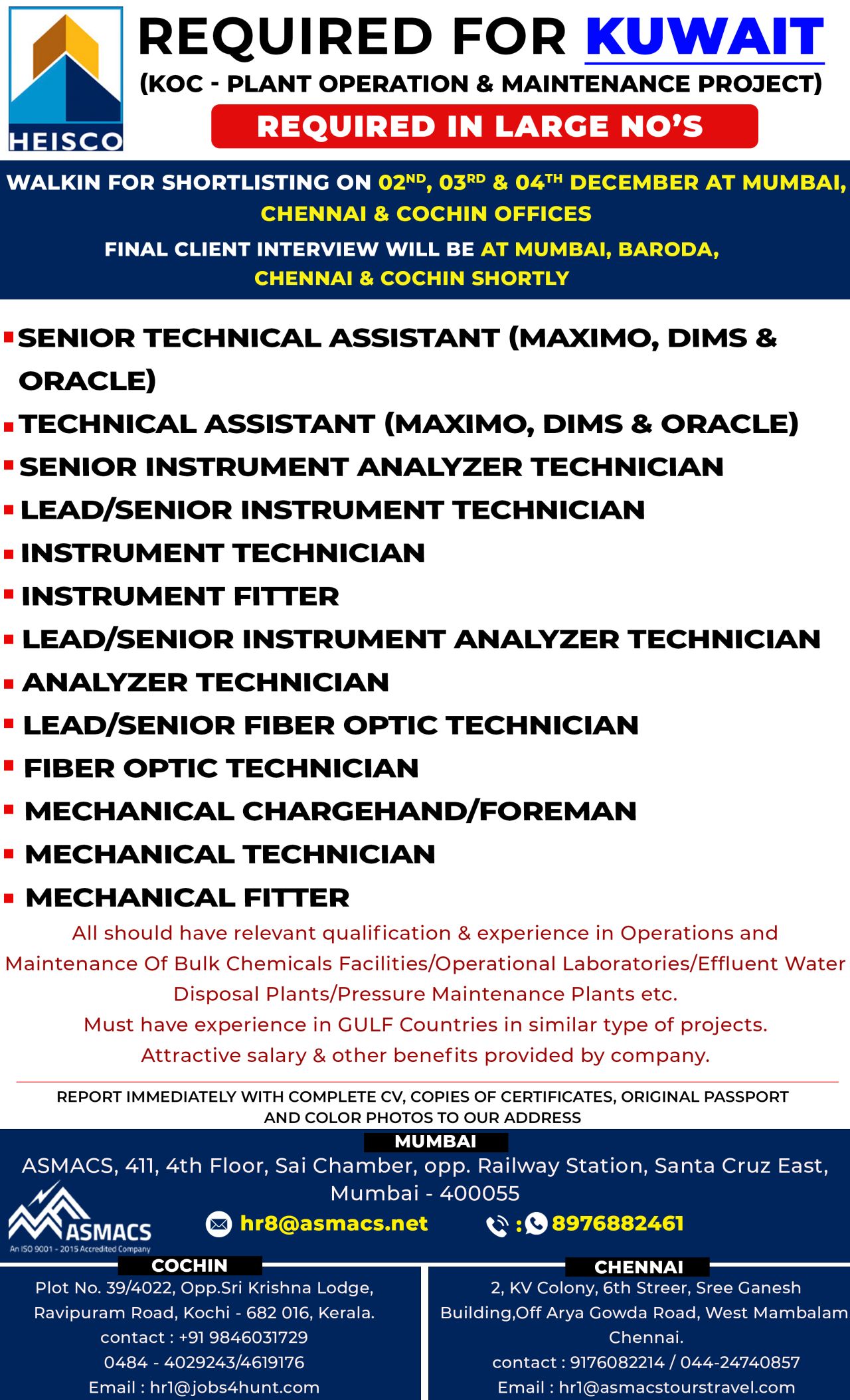 WALKIN FOR SHORTLISTING ON 02ND, 03RD & 04TH DECEMBER AT MUMBAI,