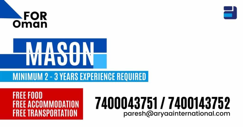 Required for Oman 17 May 2021 Telegram Group Join Now FOR OmanMINIMUM 2 – 3 YEARS EXPERIENCE REQUIREDFREE FOODFREE ACCOMMODATIONFREE TRANSPORTATION740004375117400143752paresh@aryaainternational.com Telegram Group Join Now