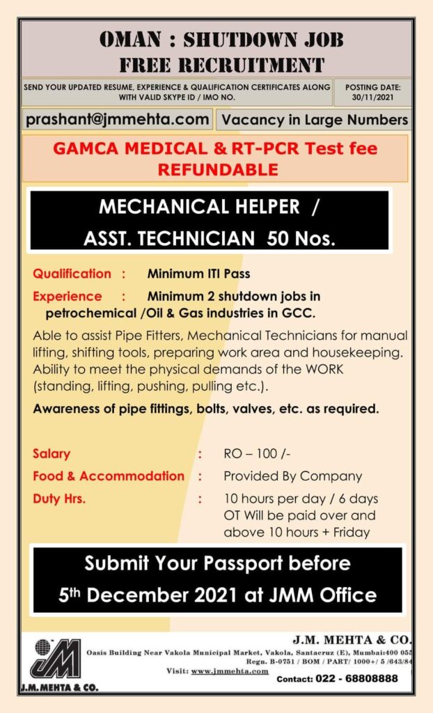 Able to assist Pipe Fitters, Mechanical Technicians for manual