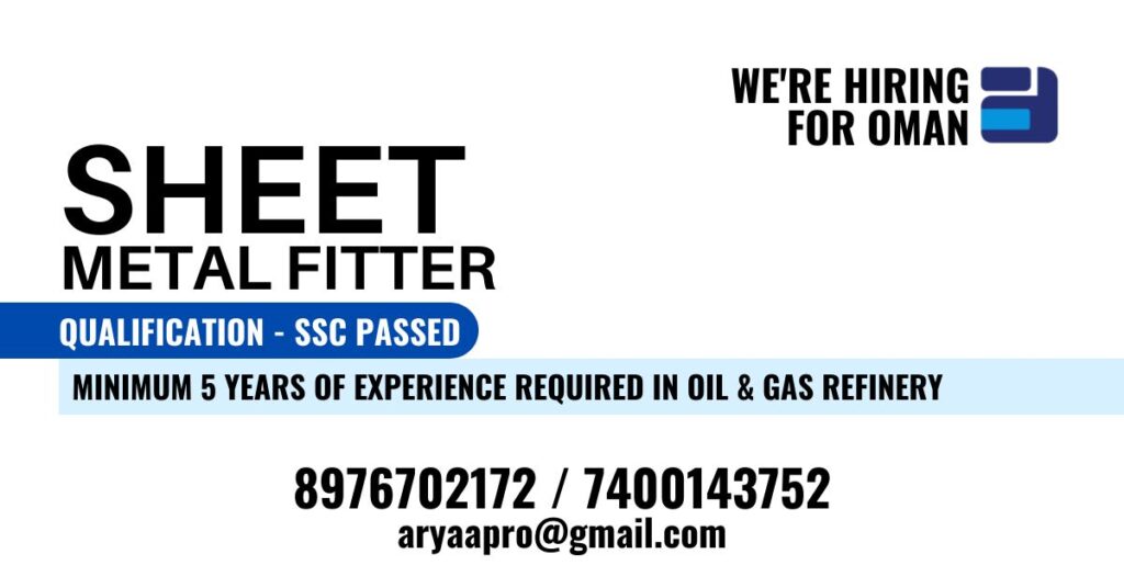 Required for Oman 11 April 2022 Telegram Group Join Now WE’RE HIRINGFOR OMANSHEETMETAL FITTERQUALIFICATION – SSC PASSEDMINIMUM 5 YEARS OF EXPERIENCE REQUIRED IN OIL & GAS REFINERY8976702172 / 7400143752aryaapro@gmail.com Telegram Group Join Now