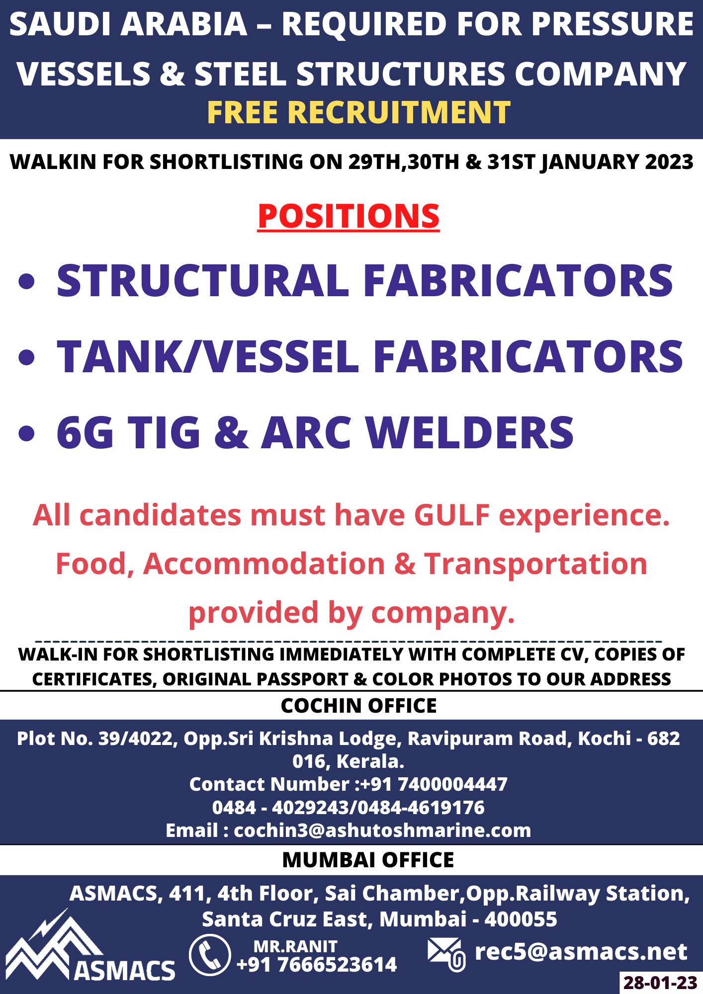WALKIN FOR SHORTLISTING ON 29TH,30TH & 31ST JANUARY 2023