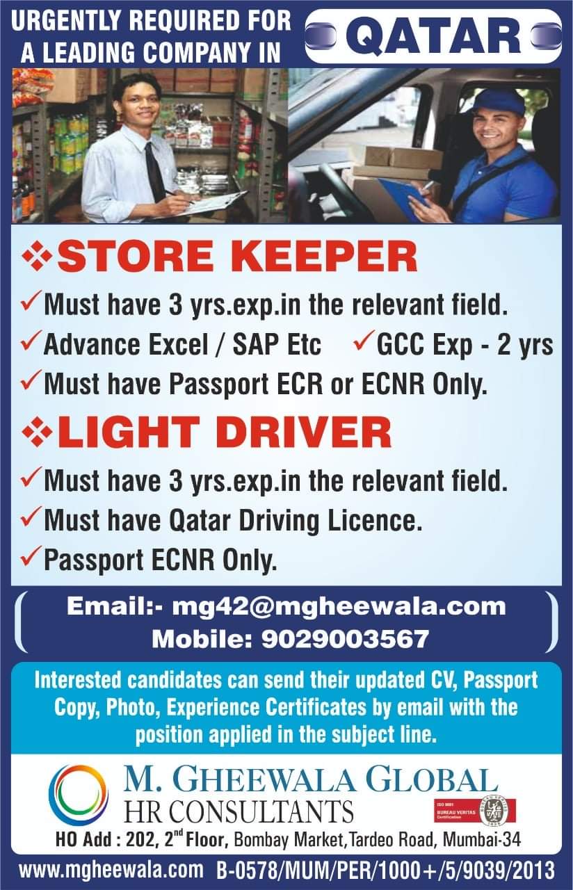 STORE KEEPER Must have 3 yrs.exp.in the relevant field.