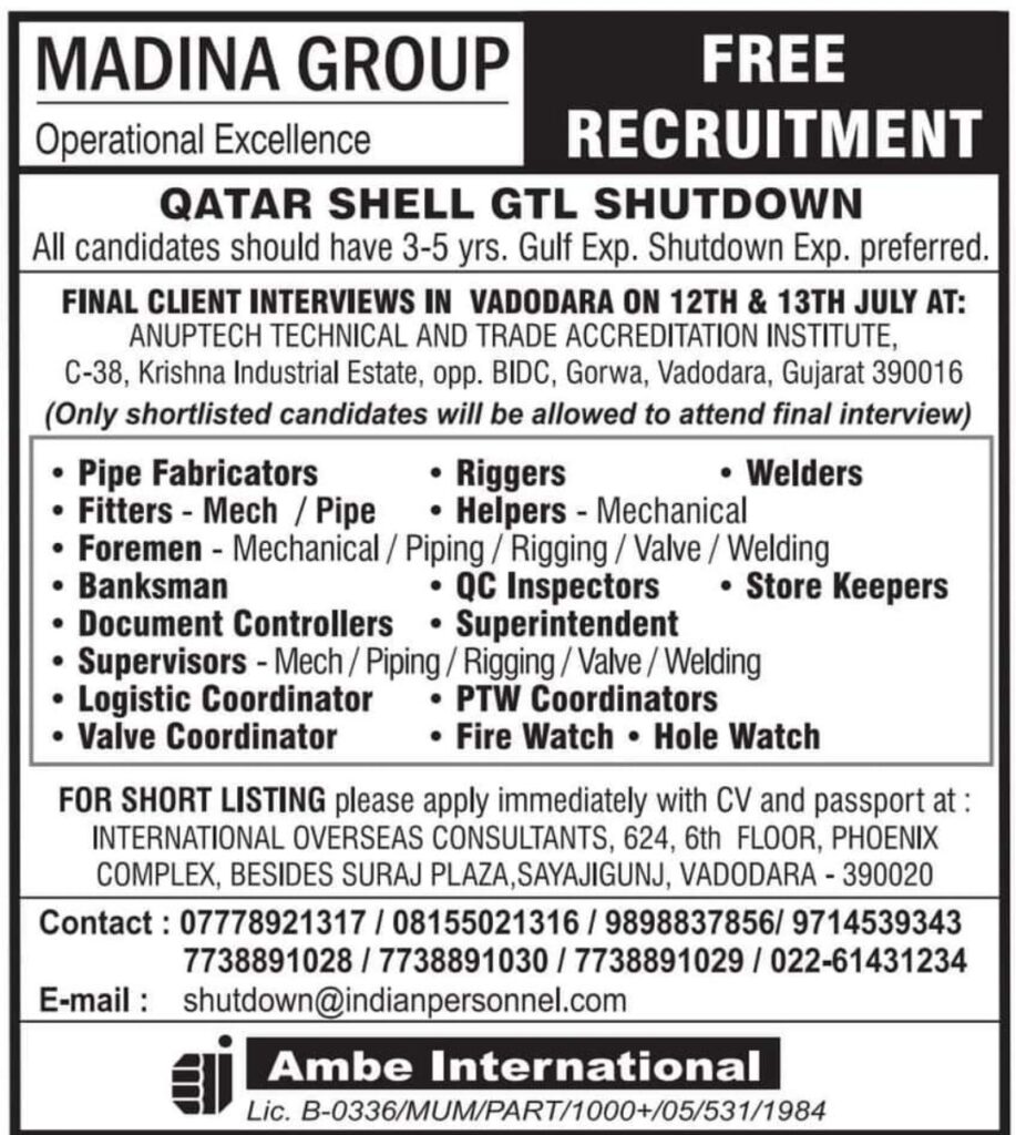 All candidates should have 3-5 yrs. Gulf Exp. Shutdown Exp. preferred.