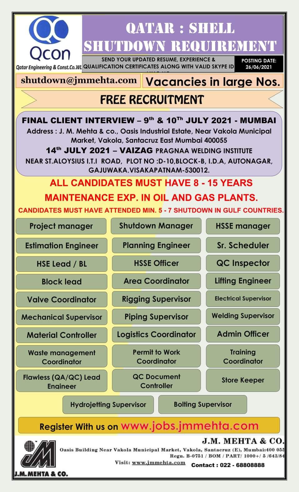 CANDIDATES MUST HAVE ATTENDED MIN. 5 – 7 SHUTDOWN IN GULF COUNTRIES.