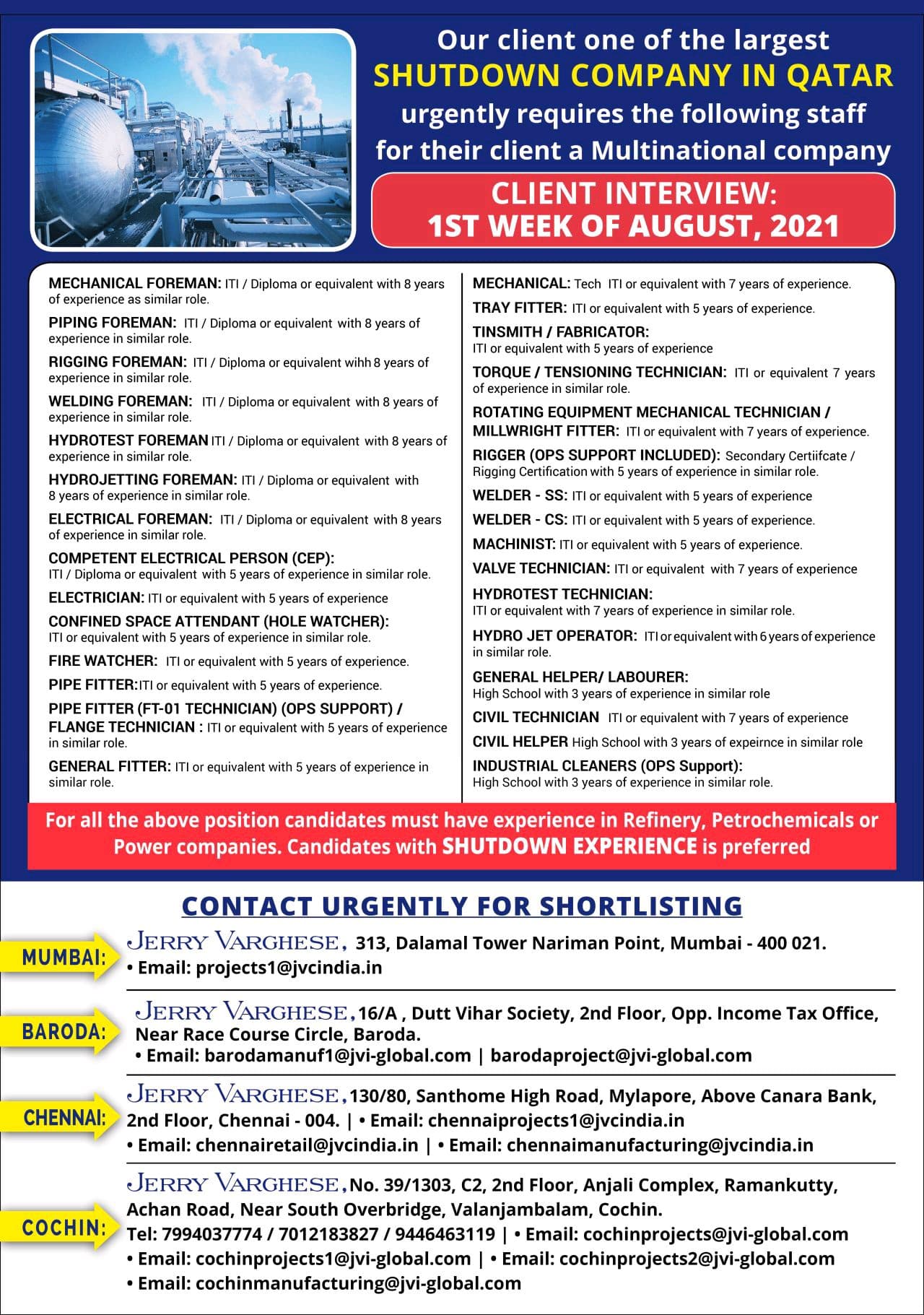 For all the above position candidates must have experience in Refinery, Petrochemicals or