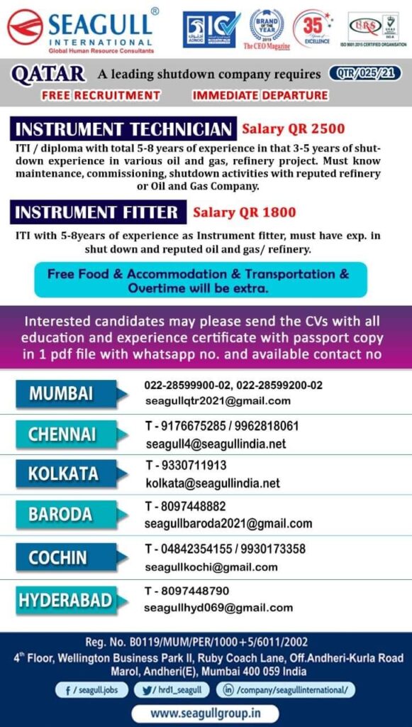 ITI with 5-8years of experience as Instrument fitter, must have exp. in