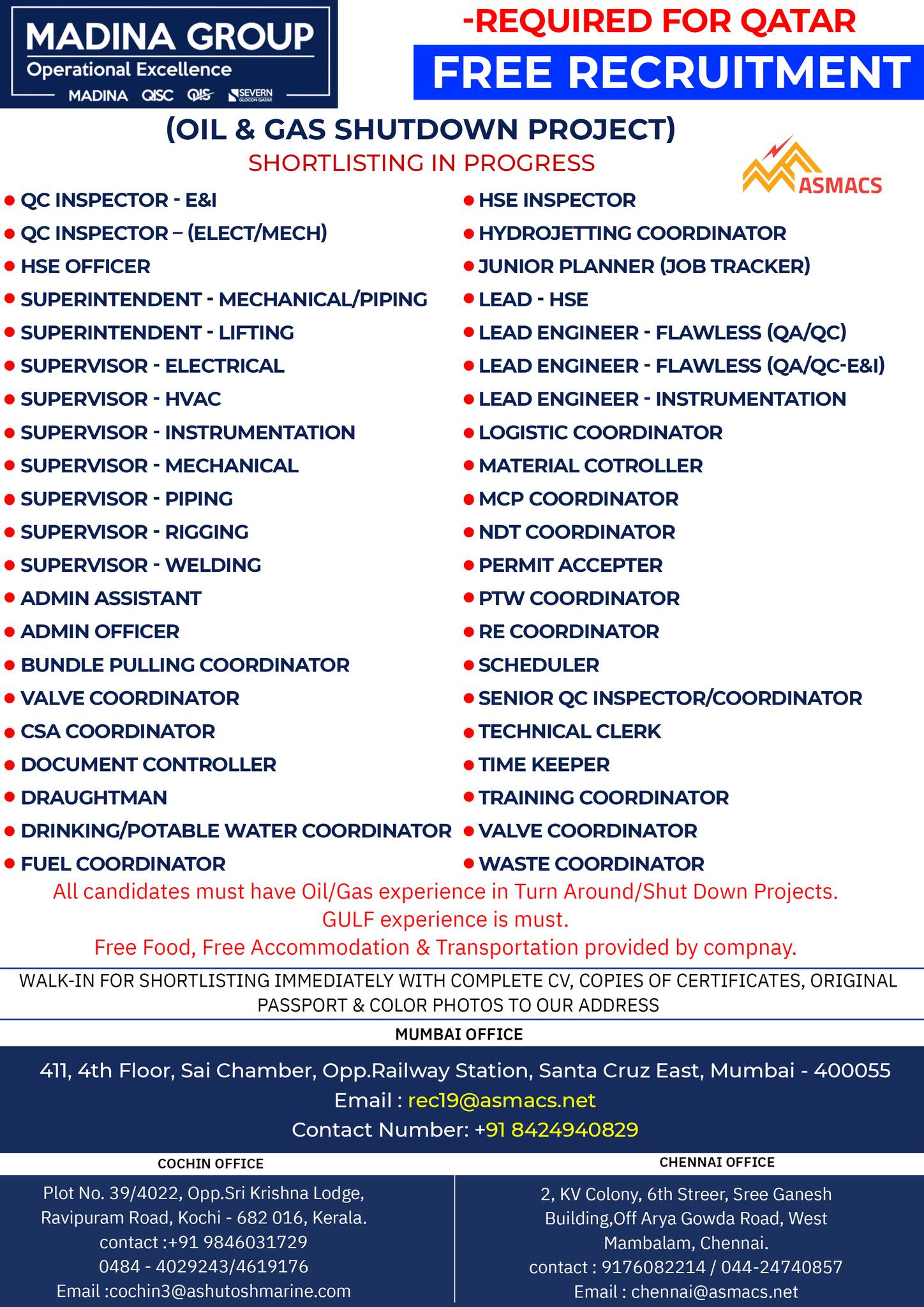 All candidates must have Oil/Gas experience in Turn Around/Shut Down Projects.