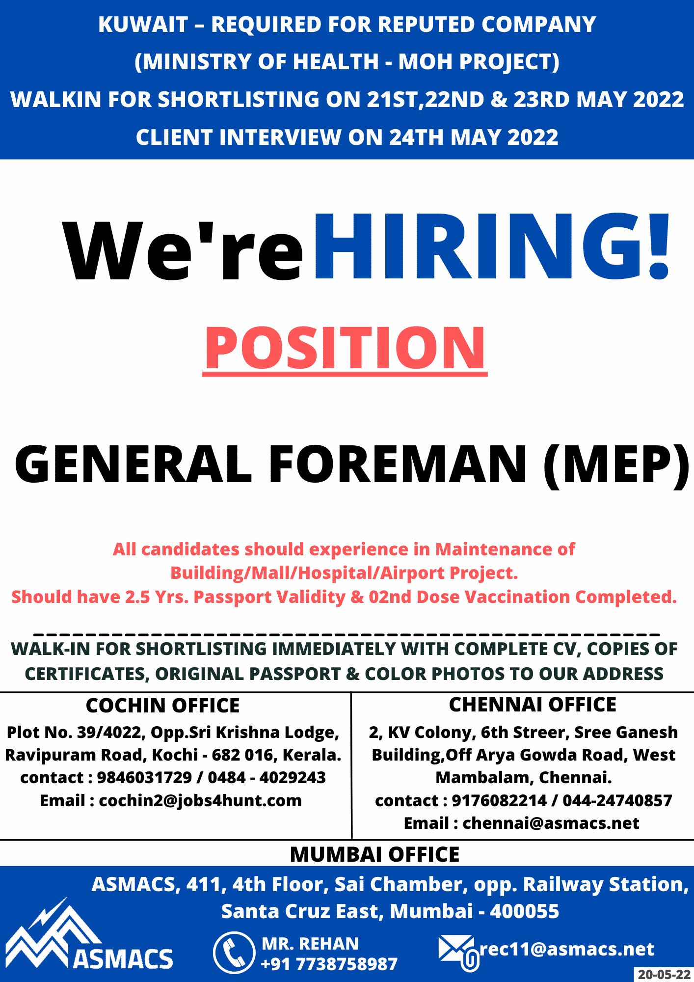 WALKIN FOR SHORTLISTING ON 21ST,22ND & 23RD MAY 2022