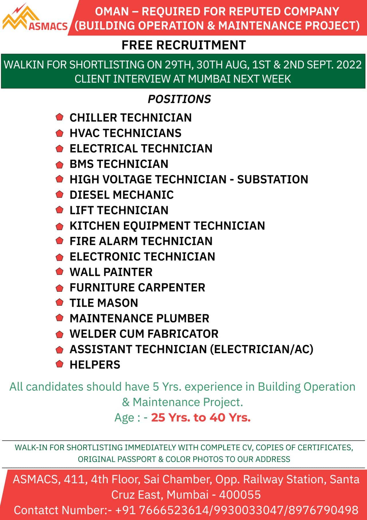 All candidates should have 5 Yrs. experience in Building Operation