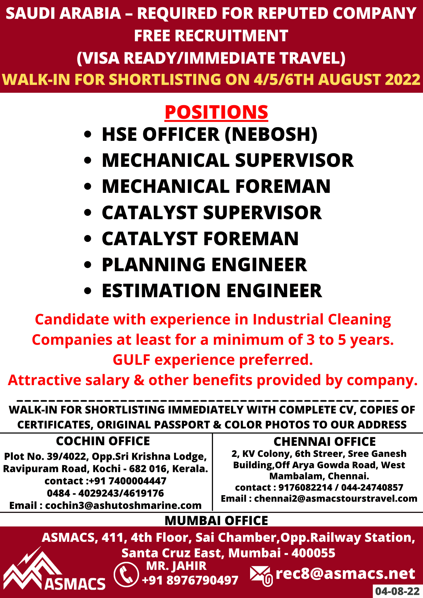 WALK-IN FOR SHORTLISTING ON 41516TH AUGUST 2022