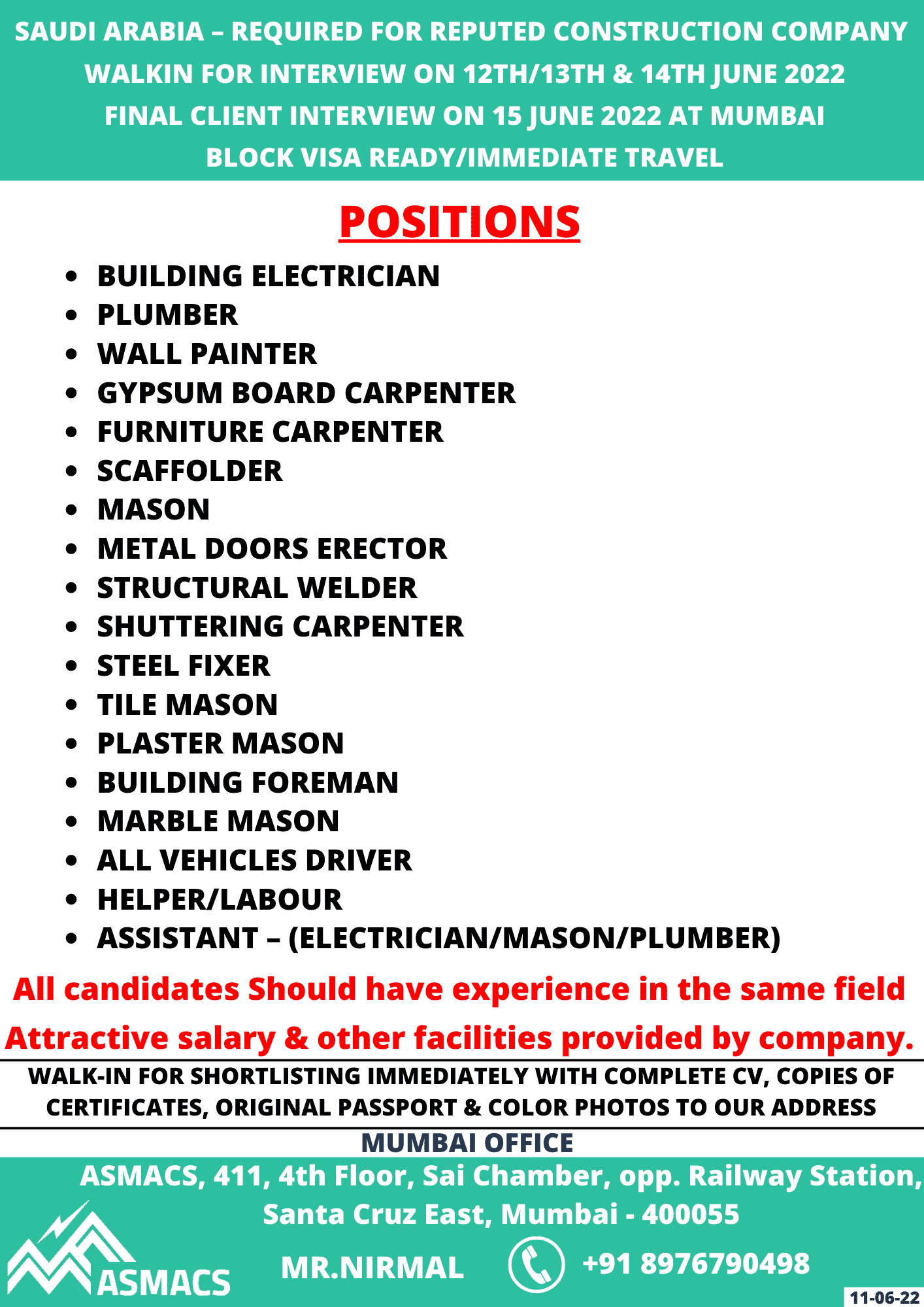 SAUDI ARABIA – REQUIRED FOR REPUTED CONSTRUCTION COMPANY