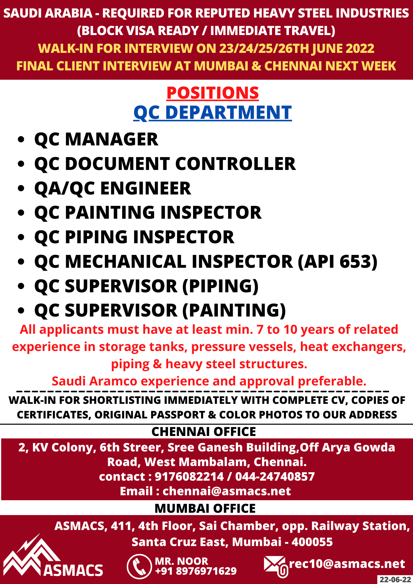 WALK-IN FOR INTERVIEW ON 23/24/25/26TH JUNE 2022