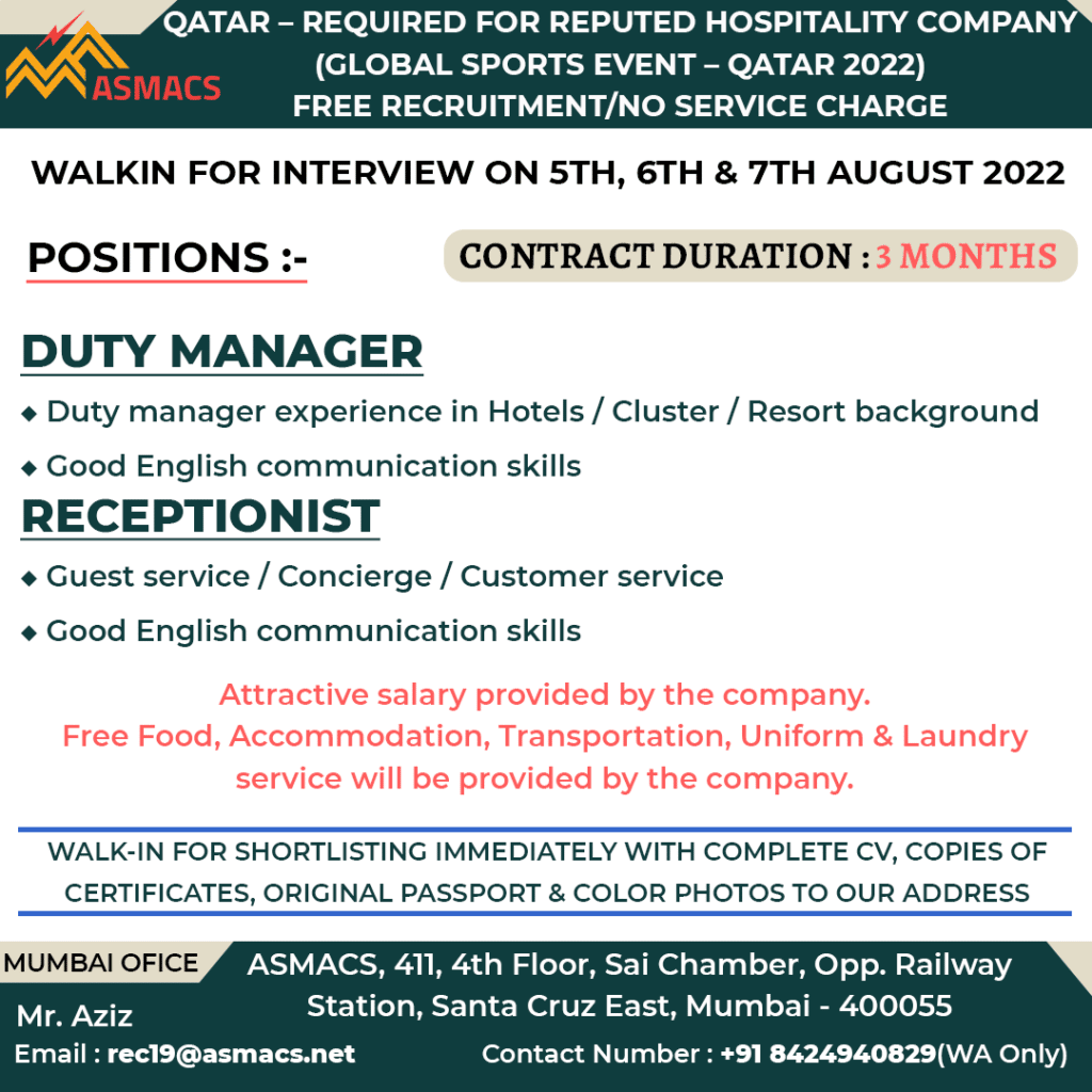 QATAR – REQUIRED FOR REPUTED HOSPITALITY COMPANY