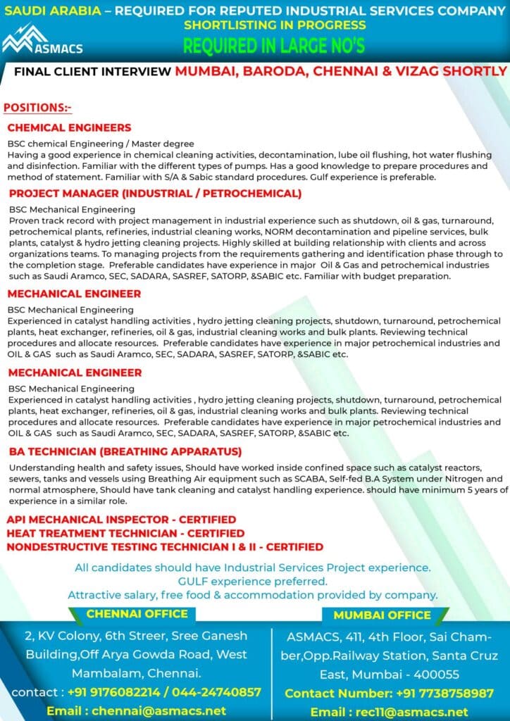 SAUDI ARABIA – REQUIRED FOR REPUTED INDUSTRIAL SERVICES COMPANY