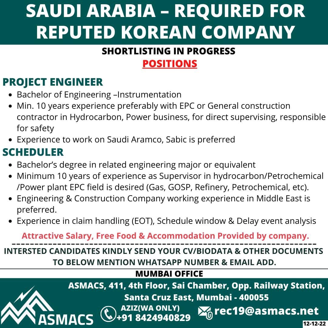 • Experience to work on Saudi Aramco, Sabic is preferred