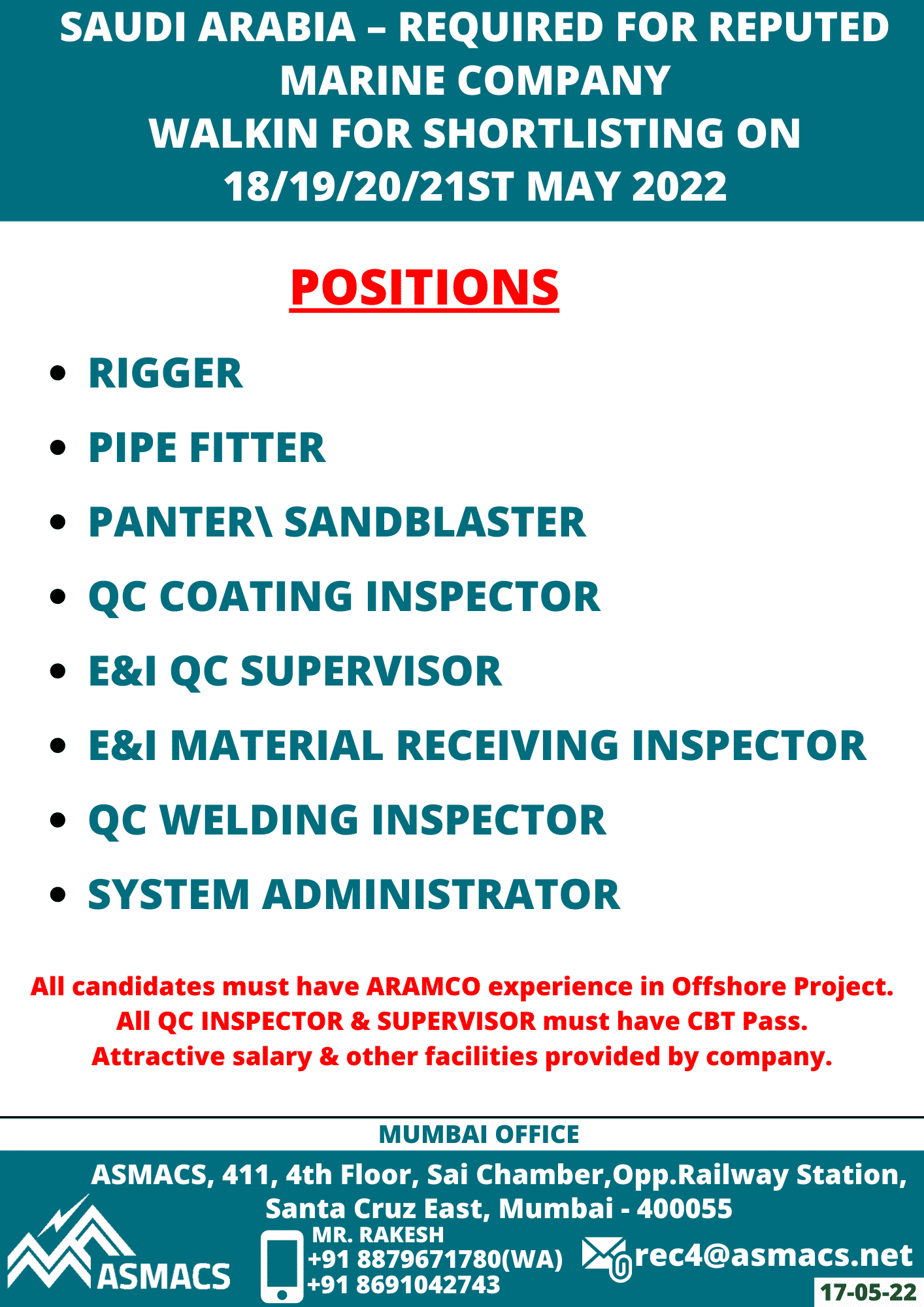 All candidates must have ARAMCO experience in Offshore Project.