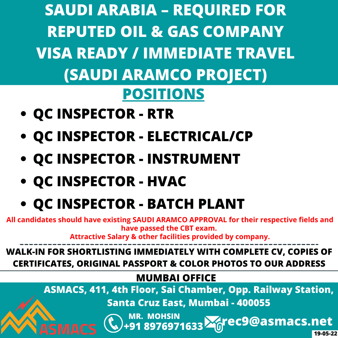 All candidates should have existing SAUDI ARAMCO APPROVAL for their respective fields and