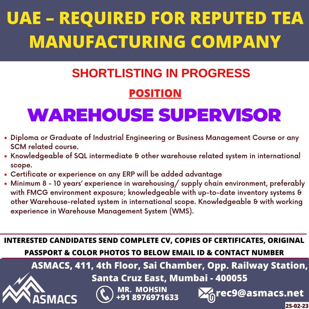 • Minimum 8 – 10 years’ experience in warehousing/ supply chain environment, preferably