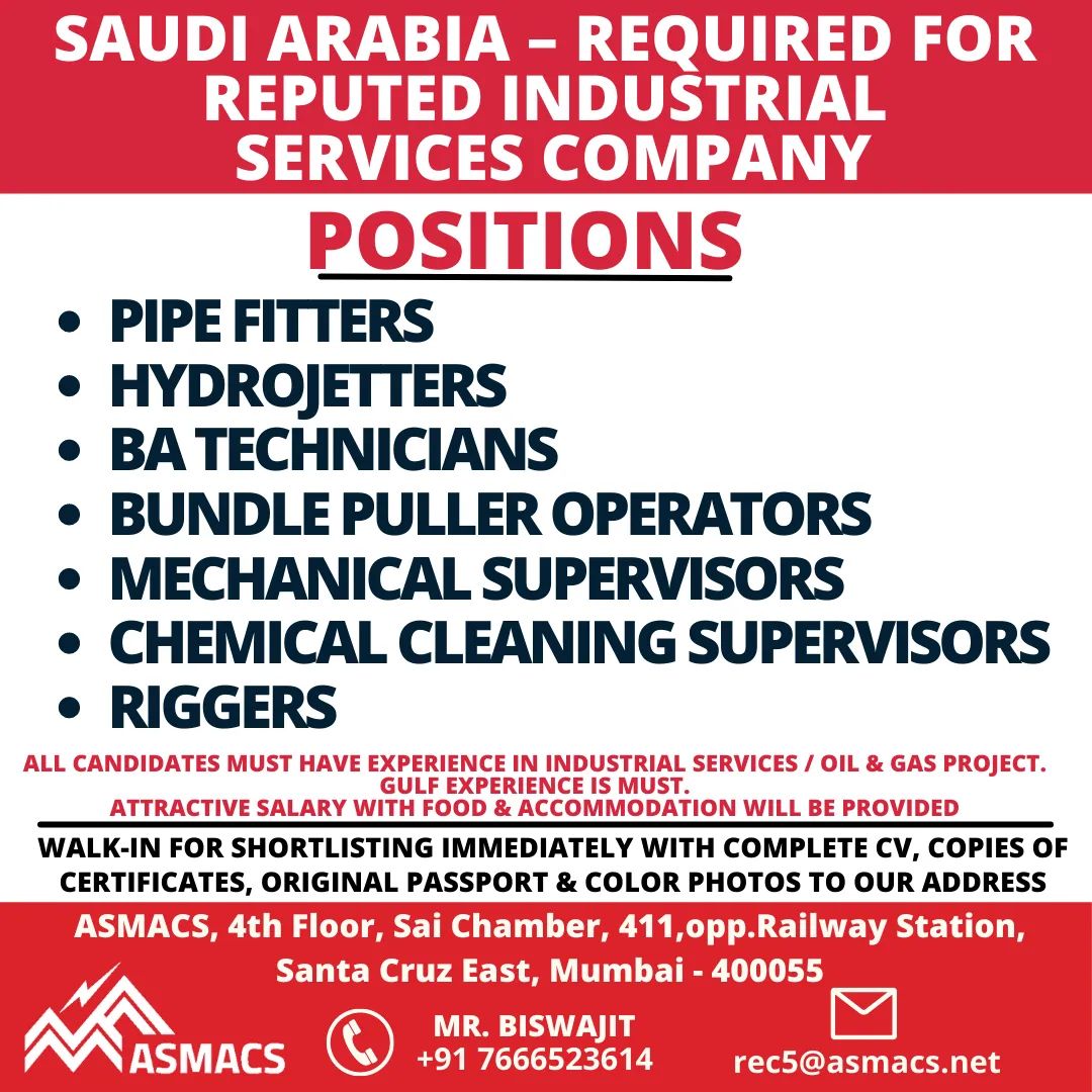GULF EXPERIENCE IS MUST. ATTRACTIVE SALARY WITH FOOD & ACCOMMODATION WILL BE PROVIDED WALK-IN FOR SHORTLISTING IMMEDIATELY WITH COMPLETE CV, COPIES OF CERTIFICATES, ORIGINAL PASSPORT & COLOR PHOTOS TO OUR ADDRESS ASMACS, 4th Floor, Sai Chamber, 411,opp.Railway Station,