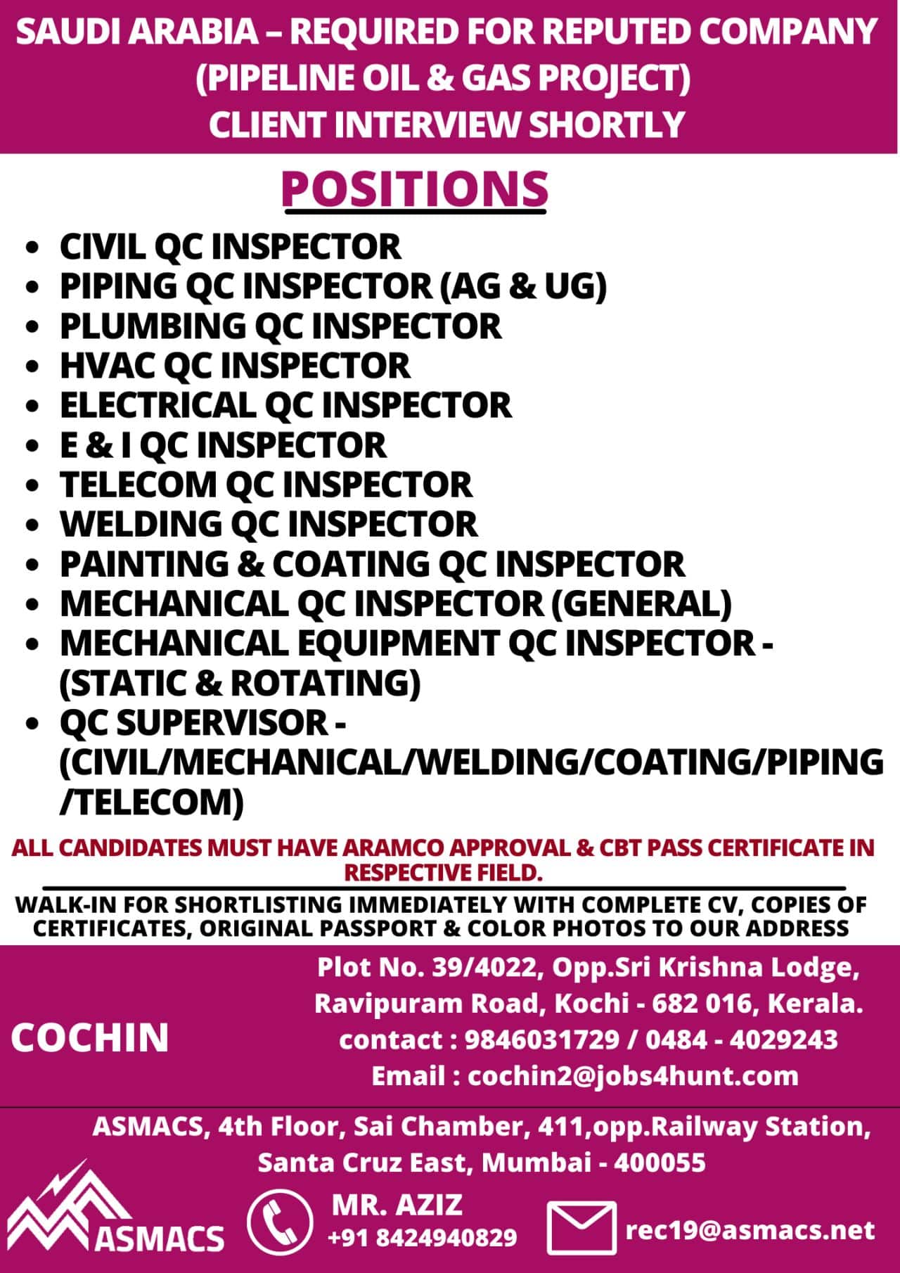 POSITIONS • CIVIL QC INSPECTOR • PIPING QC INSPECTOR (AG & UG)