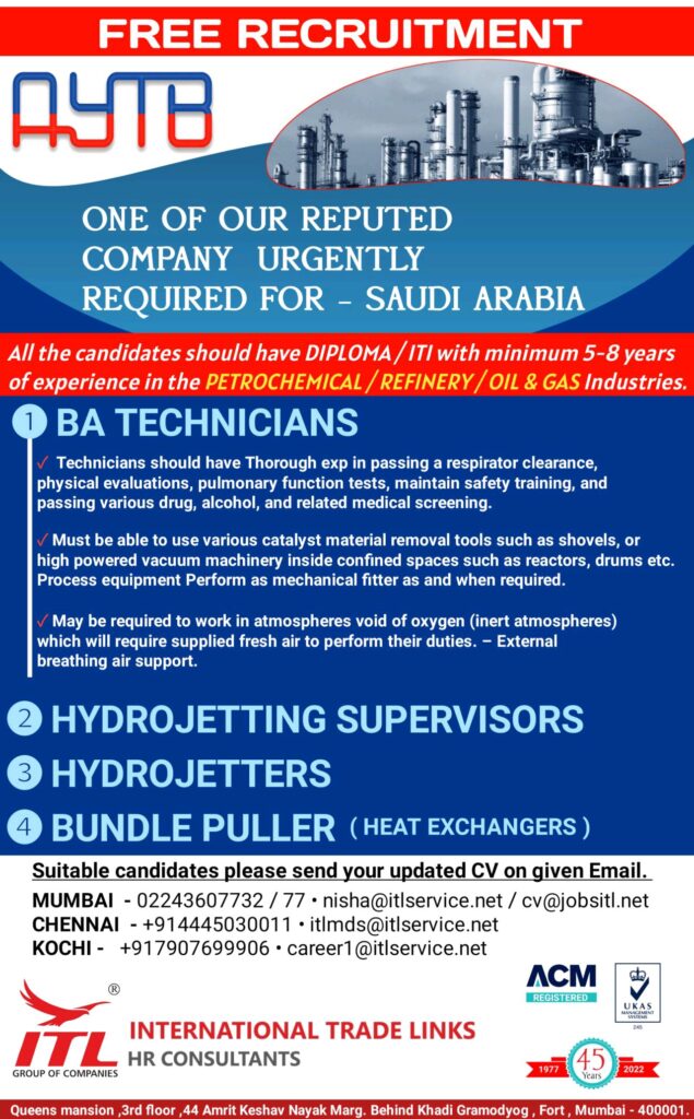 MUMBAI – 02243607732 / 77. nisha@itlservice.net/cv@jobsitl.net