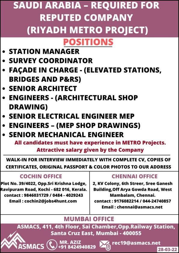 All candidates must have experience in METRO Projects.