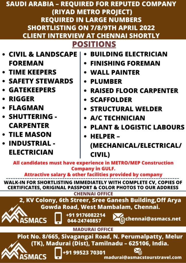 All candidates must have experience in METRO/MEP Construction