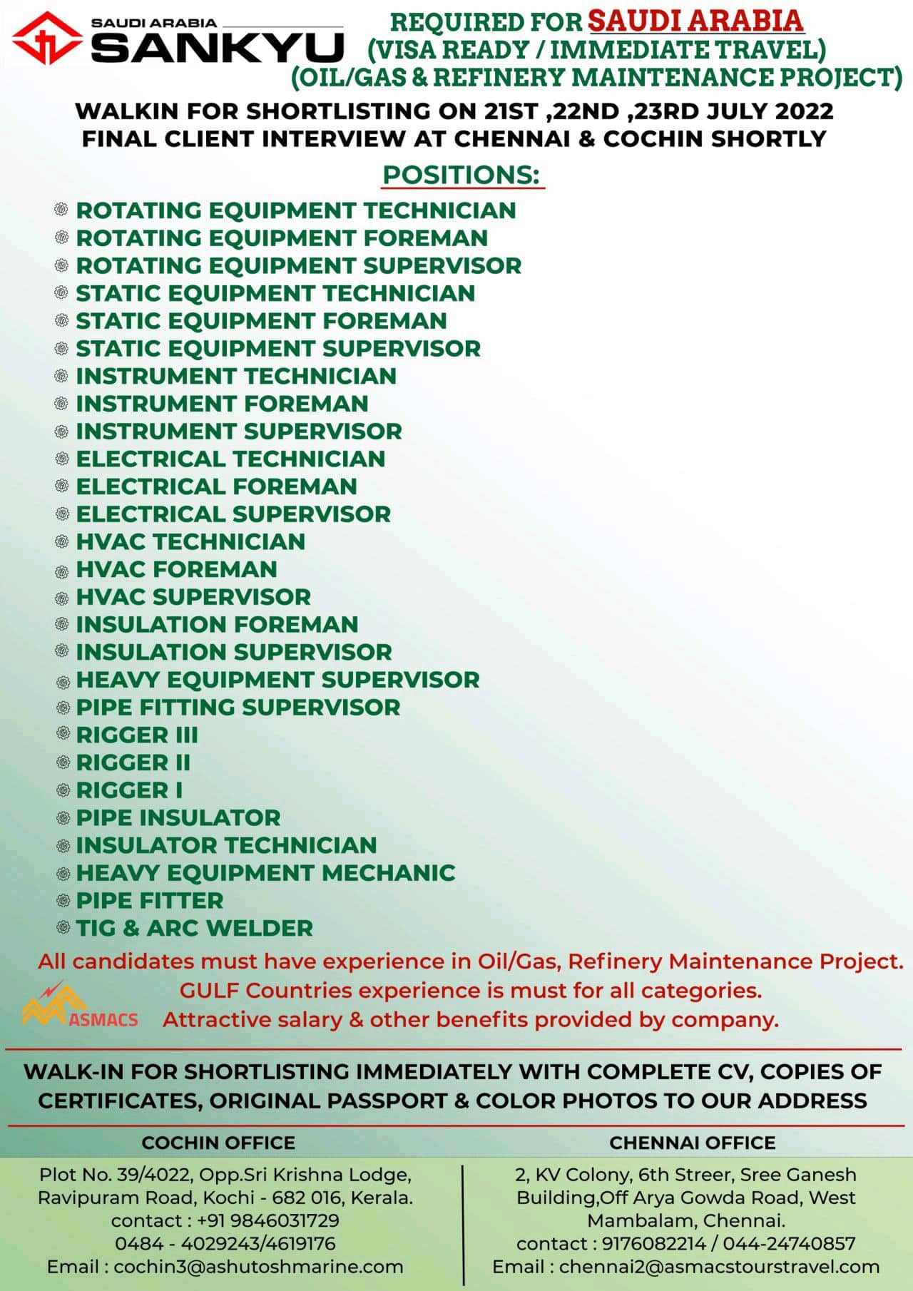 All candidates must have experience in Oil/Gas, Refinery Maintenance Project.