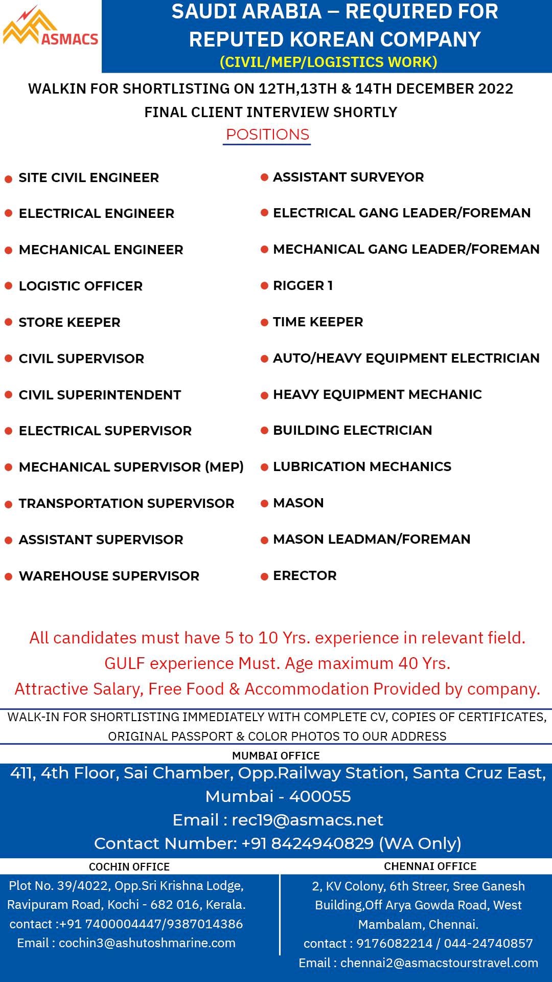 WALKIN FOR SHORTLISTING ON 12TH,13TH & 14TH DECEMBER 2022