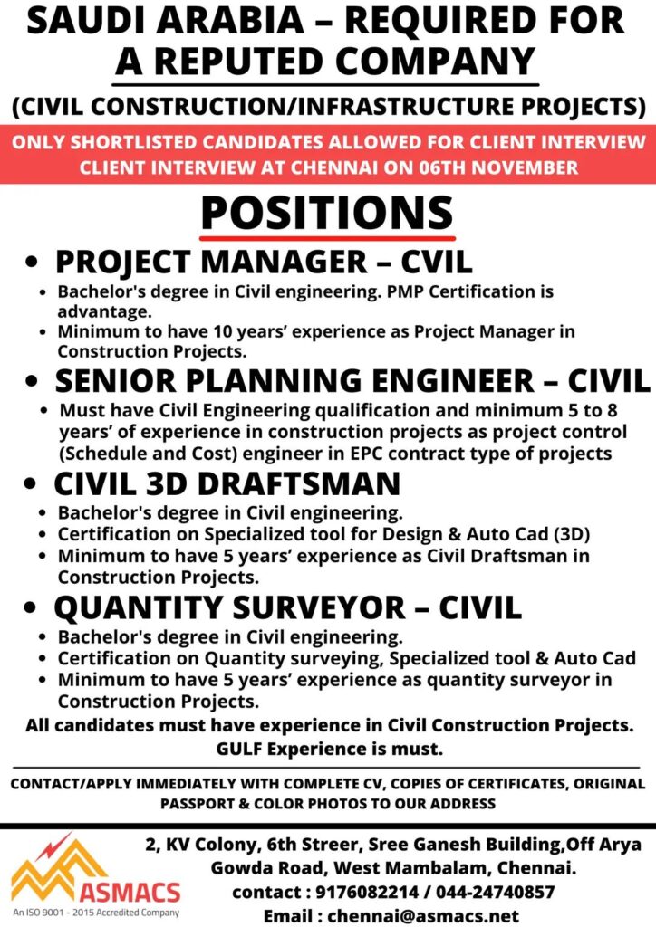 All candidates must have experience in Civil Construction Projects.