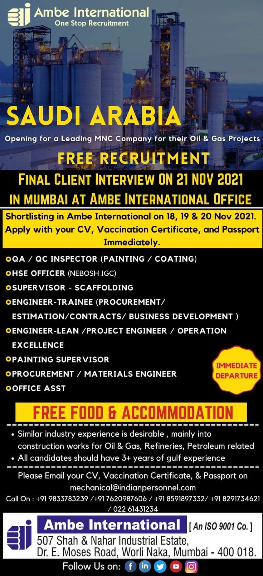 Shortlisting in Ambe International on 18, 19 & 20 Nov 2021.