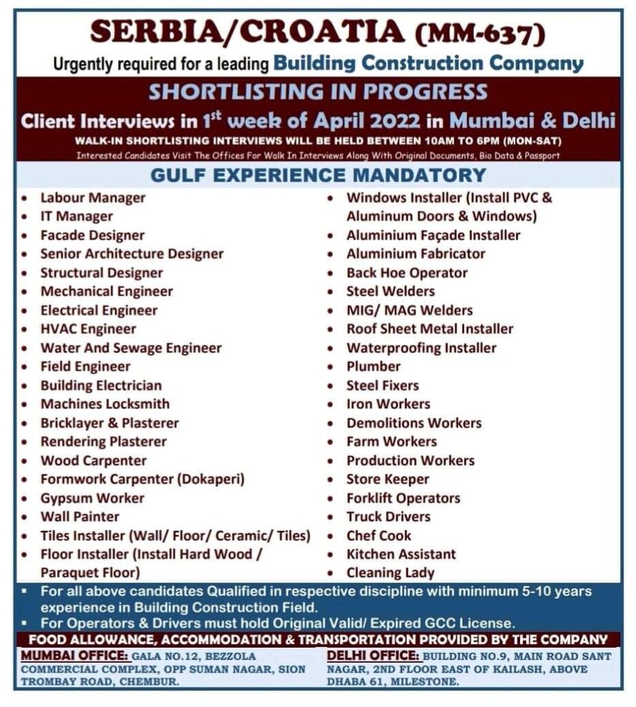 Interested candidates Visit The Offices For Walk In Interviews Along With Original Documents, Bio Data & Passport