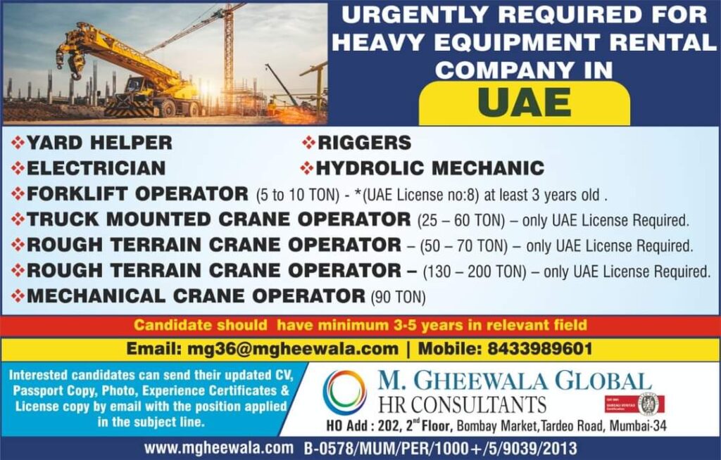 *TRUCK MOUNTED CRANE OPERATOR (25 – 60 TON) – only UAE License Required.