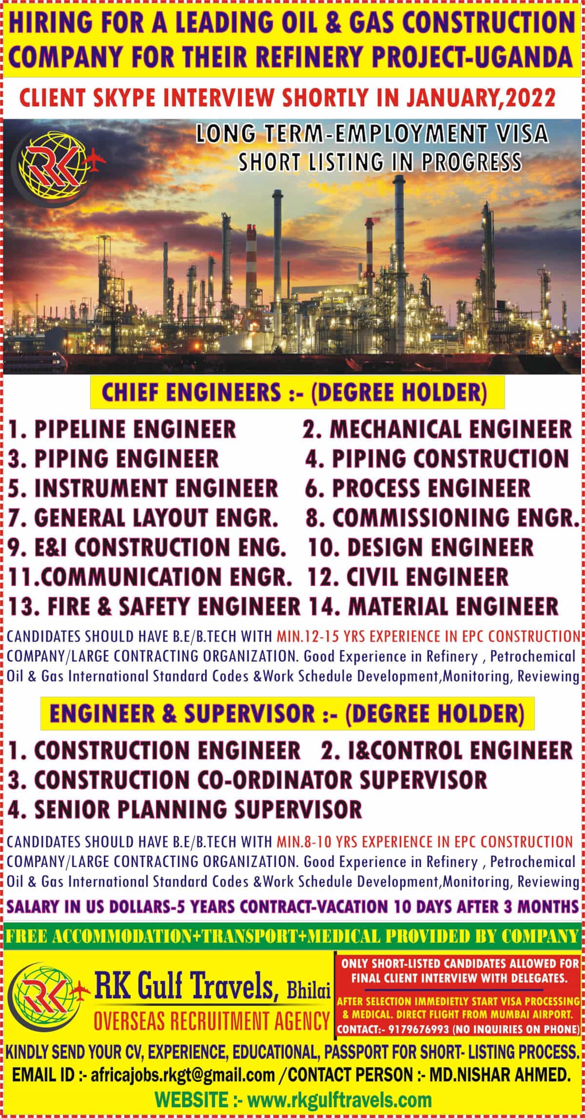 HIRING FOR A LEADING OIL & GAS CONSTRUCTION COMPANY FOR THEIR REFINERY PROJECT-UGANDA CLIENT SKYPE INTERVIEW SHORTLY IN JANUARY,2022